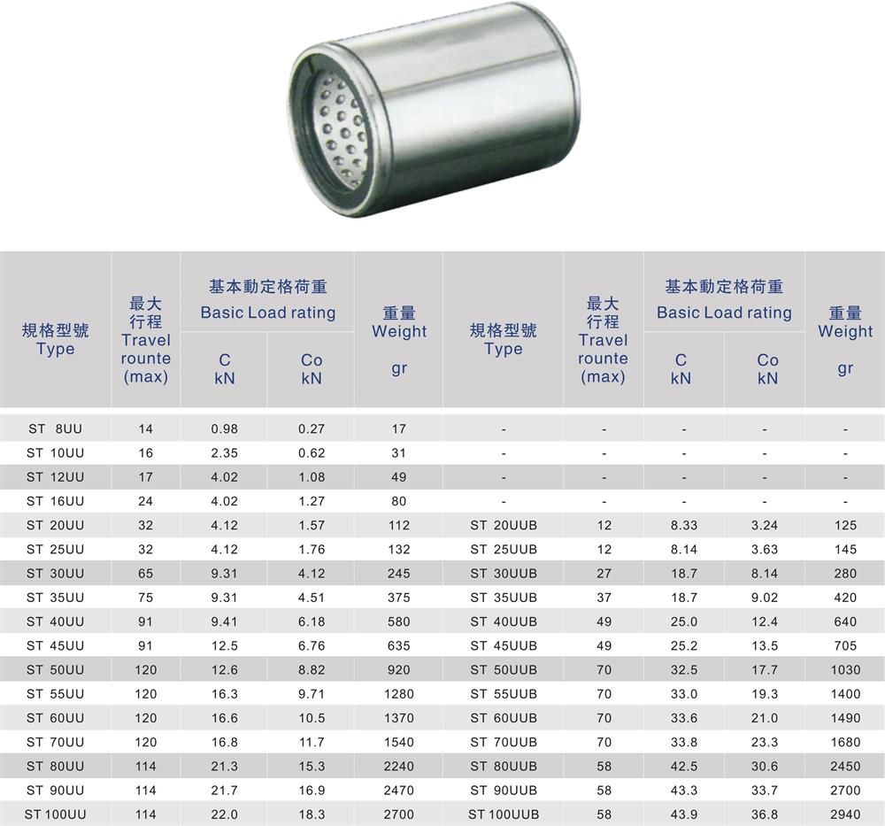 ST-UU/ST-UUB直線軸承是用金屬做成的,是一種以低成本生產(chǎn)而換取高效益的直線運動系統(tǒng),用于圓柱軸與無限行程之間配合使用。廣泛應(yīng)用于紡織、食品包裝、精密機床、印刷、精密機械等工業(yè)生產(chǎn)上的滑動部件,就是一種直線運動系統(tǒng),在此其中,由于承載球與軸承外套點接觸后,鋼球就以最小的摩擦力滾動,組織滾動過快而得到不到效果,所以,直線承載的摩擦力是很小的且比較穩(wěn)定,不會隨著軸承速度而變化,平穩(wěn)直線運動都是靈敏度高、精度高,優(yōu)點雖然頗多,但直線軸承消耗也有局限性,主要是因為軸承沖擊載荷能力比較差,而自身的承載能力也是比較差的,所以這是需要改正的,自身有很多不足,其次呢,直線軸承在高速運動時振動幅度高,噪聲大,很不穩(wěn)定,萬事都有兩面性。
