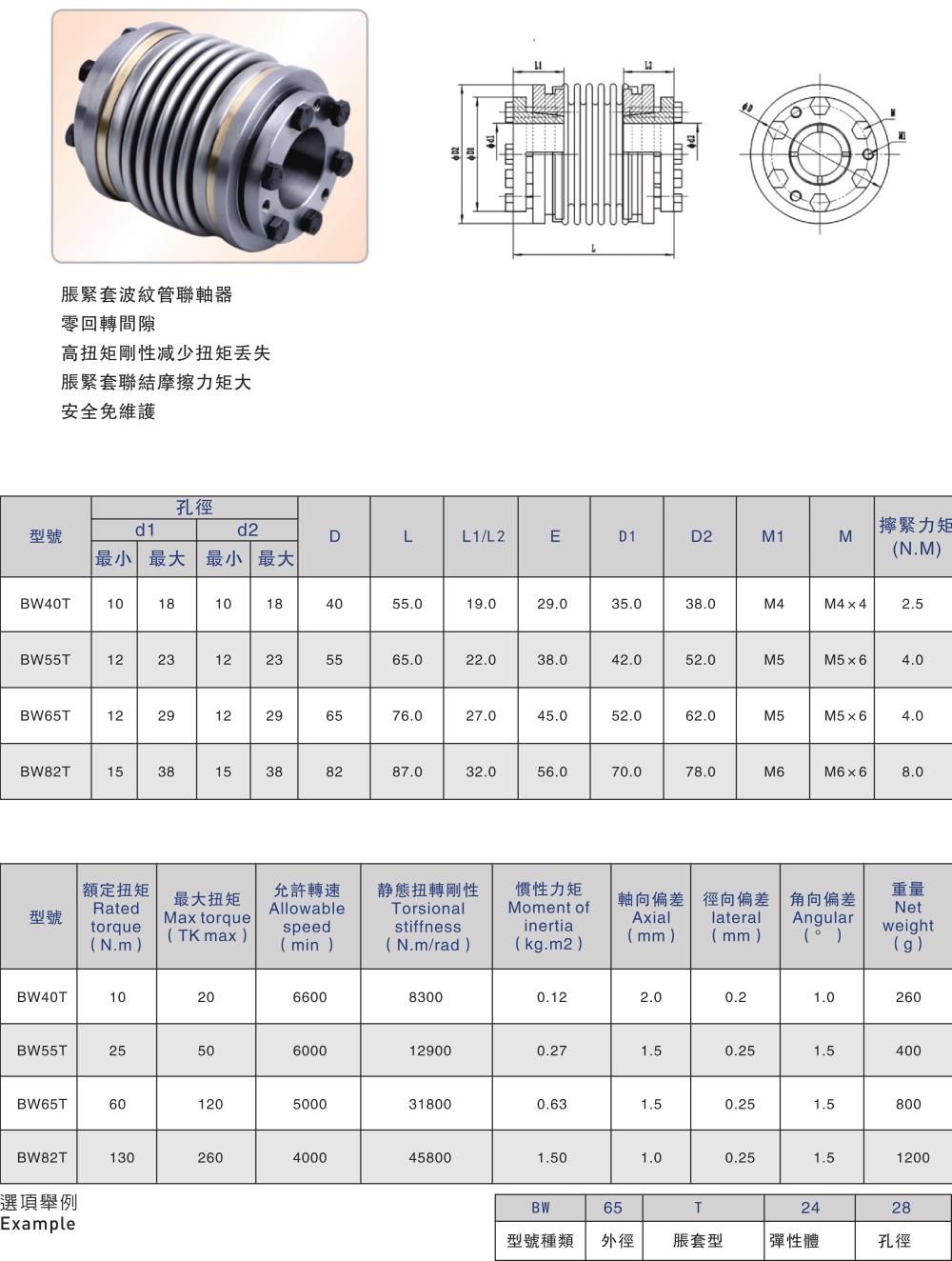 BW-T波紋管聯軸器主要是指聯接兩軸或軸與回轉件,一同回轉在傳遞運動和動力過程中,在非正常情況下會脫離開而正常情況下不脫開的一種機器裝置,它也可以作為一種安全防護裝置,從而使聯接機件承受過大的載荷而不壞掉,起過載保護的作用。聯軸器又稱聯軸節,是機械關節所在地,可以將機構不同中的從動軸和主動軸牢固的鏈接起來同時旋轉,并傳遞扭矩和運動的機器機械部件,有時用聯接軸等其它零件(如帶輪、齒輪等)也是可以的,常由兩半塊合成,緊固在兩軸端,再通過一些特殊的方式將兩半聯接起來,它用途還更深入,可兼有補償兩軸之間由于工作時的變形、制造安裝不精確或是熱膨脹導致高溫等原因所發生的偏移以及工作中帶來的緩和沖擊和吸振,保證機器安全。其緩沖性,對于經常在負載啟動的場合,聯軸器是可以減振、緩沖的彈性元件,來保護機器運作少受損傷,最大效果達到不受損傷,安全可靠,結構簡單,易拆易裝,維護方便。